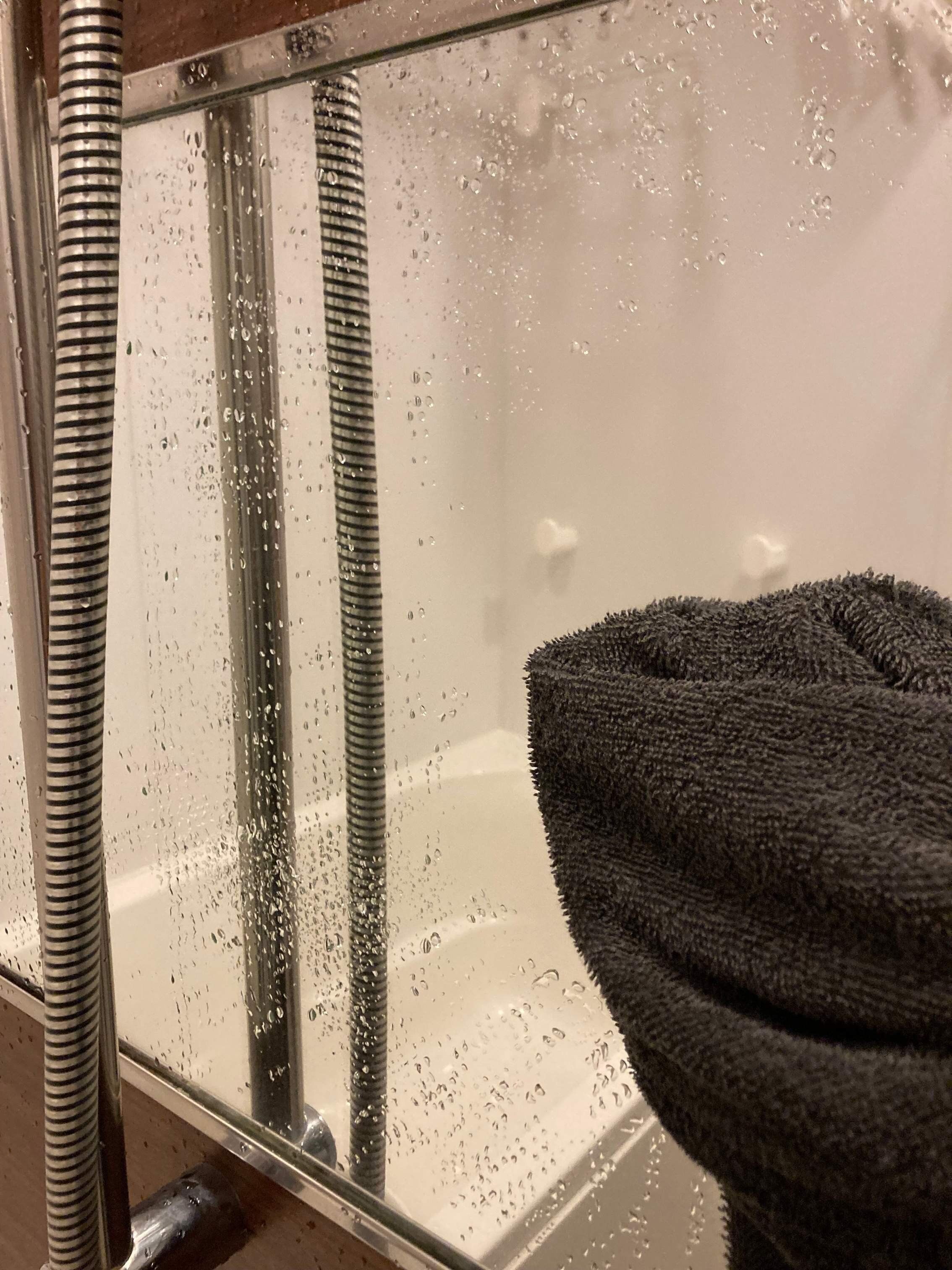 入浴後、壁面のリモコン、鏡、蛇口周り、ドアパッキンなどのカビや水垢が気になる箇所の水滴を拭き上げます。ドアパッキンは吸水スポンジで、それ以外の場所はバスタオルで拭いています。