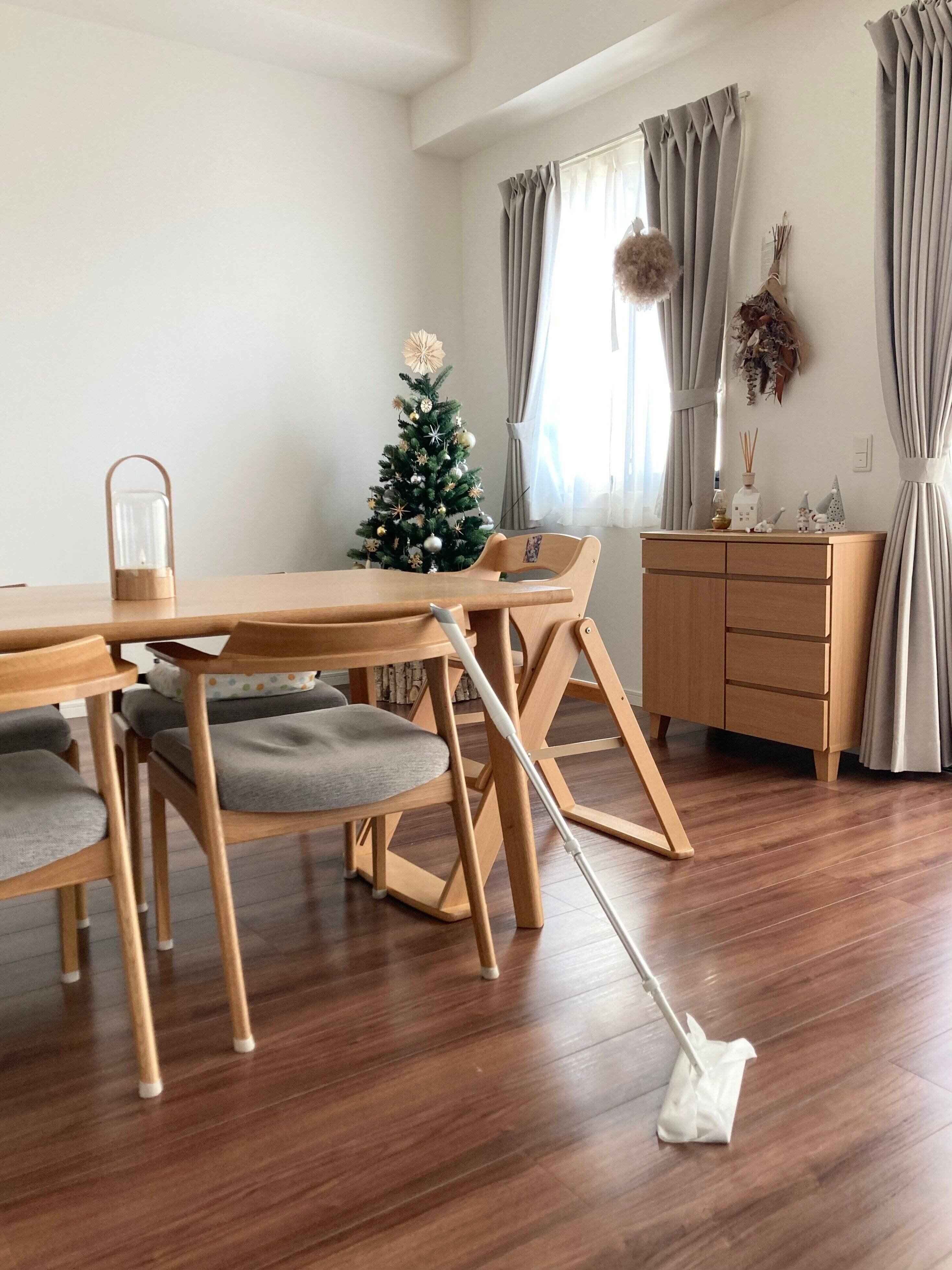 床掃除は朝一番が最適‼︎人が活動してる時間は小さい埃が空気中を舞っています。そのため人が動いていない夜中の間に床に落ちたホコリを、朝一番にクイックルワイパーで集めます。クイックルワイパーにかかる時間は3分程度。