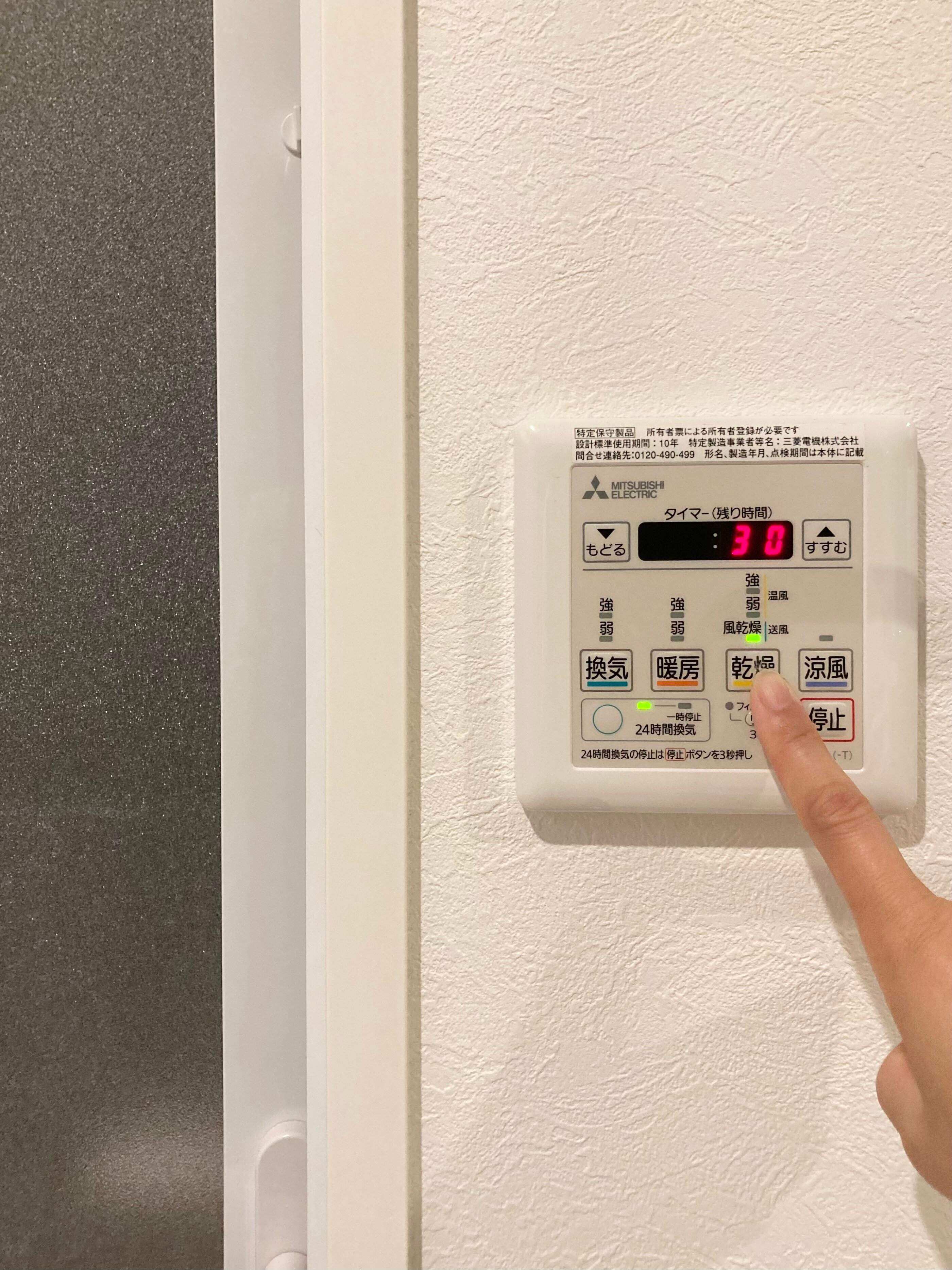 「丁寧に」ではなくサッと水滴を取る程度なので、1分かからずに終わります。拭いた後は湿気がたまらないように扉を10cmほど開けた状態で30分間浴室内の乾燥ボタンを押します。これだけで水垢汚れ、カビを軽減できます。