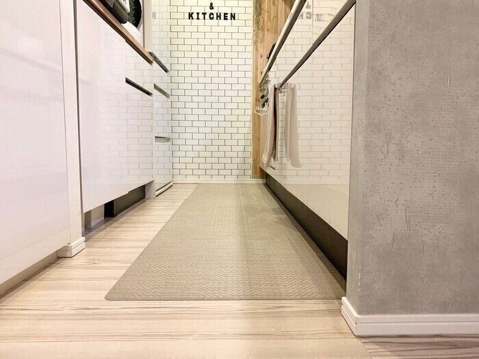 日々の掃除は、掃除機やモップ掛けでOK!汚れたらサッと拭くだけで解決!面倒を感じていた洗濯を手放せたことで家事がラクになりました。布タイプのキッチンマットを使用していた時は、洗い替え用マットを収納するスペースが必要でしたが、今はそのスペースが必要なくなりました!
