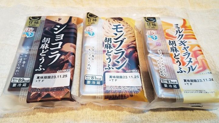 通常のラインナップは、白ごま、黒ごま、金ごまを使った一般的なごま豆腐を扱っているのですが、秋冬限定でスイーツフレーバーが登場!