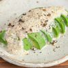 (1)アボカドは皮と種を取り除き、5mm程度の幅に切る。