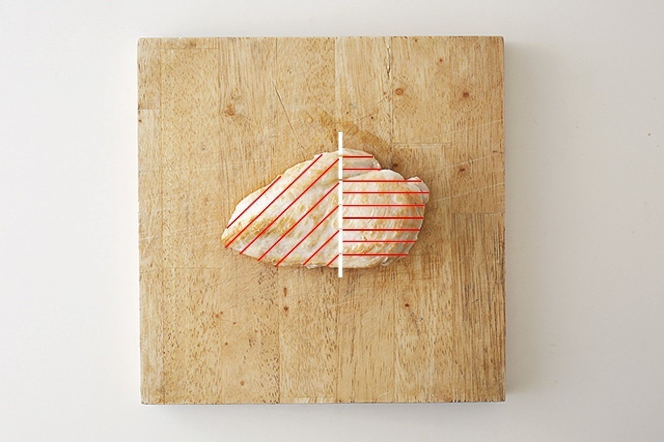 鶏胸は繊維を断つよう切ると、さらにやわらかく仕上がります。まずは、繊維の向きの変わり目(写真の中央線)でカット。右半分は横に平行に切り、左半分は斜めそぎ切りに
