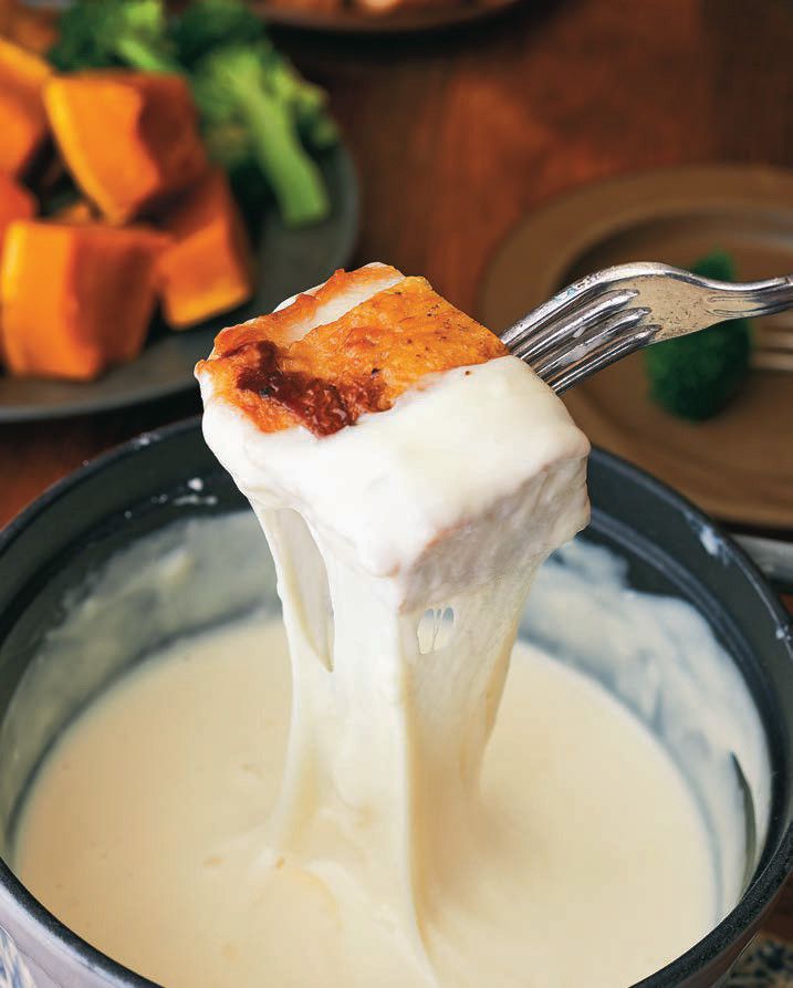 2.好みの具とともにテーブルに出し、チーズソースをつけながら食べる。ソースがさめてきたら、弱火で温め直す。