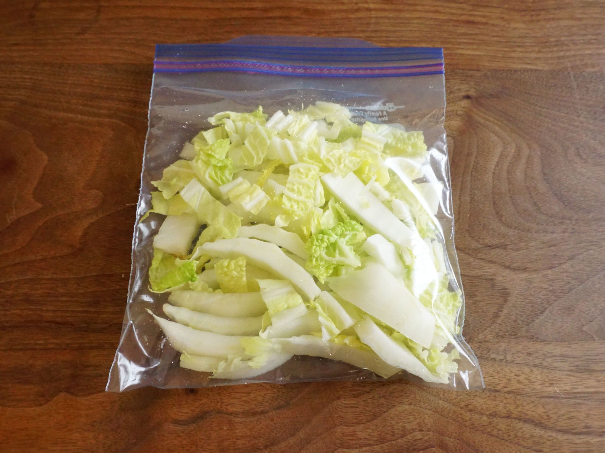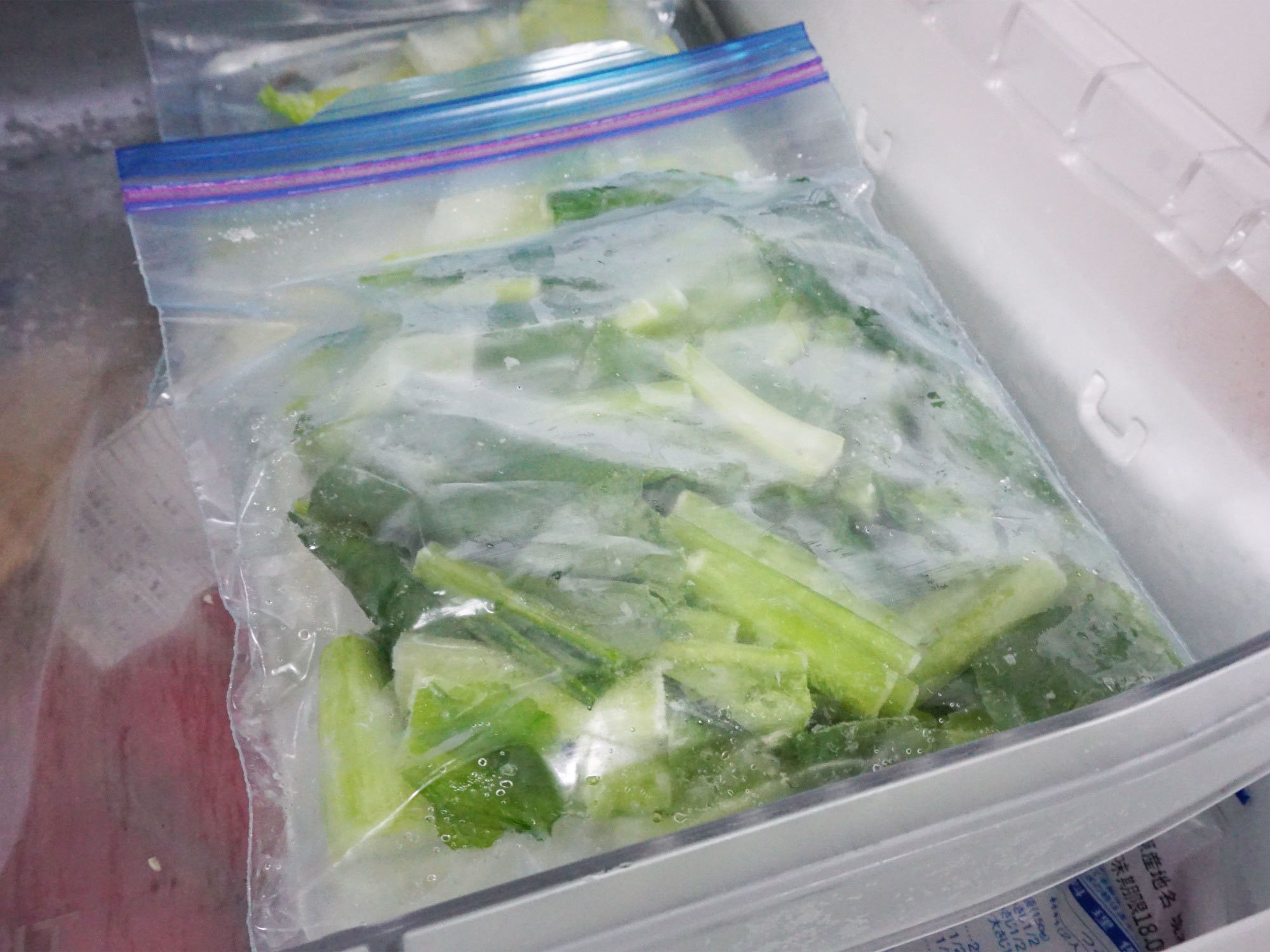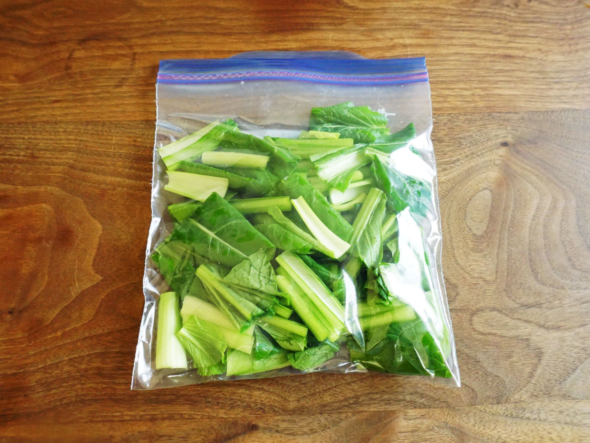 調理に合わせて切り(ざく切りなど)、フリージングバッグに平らに入れて冷凍します。