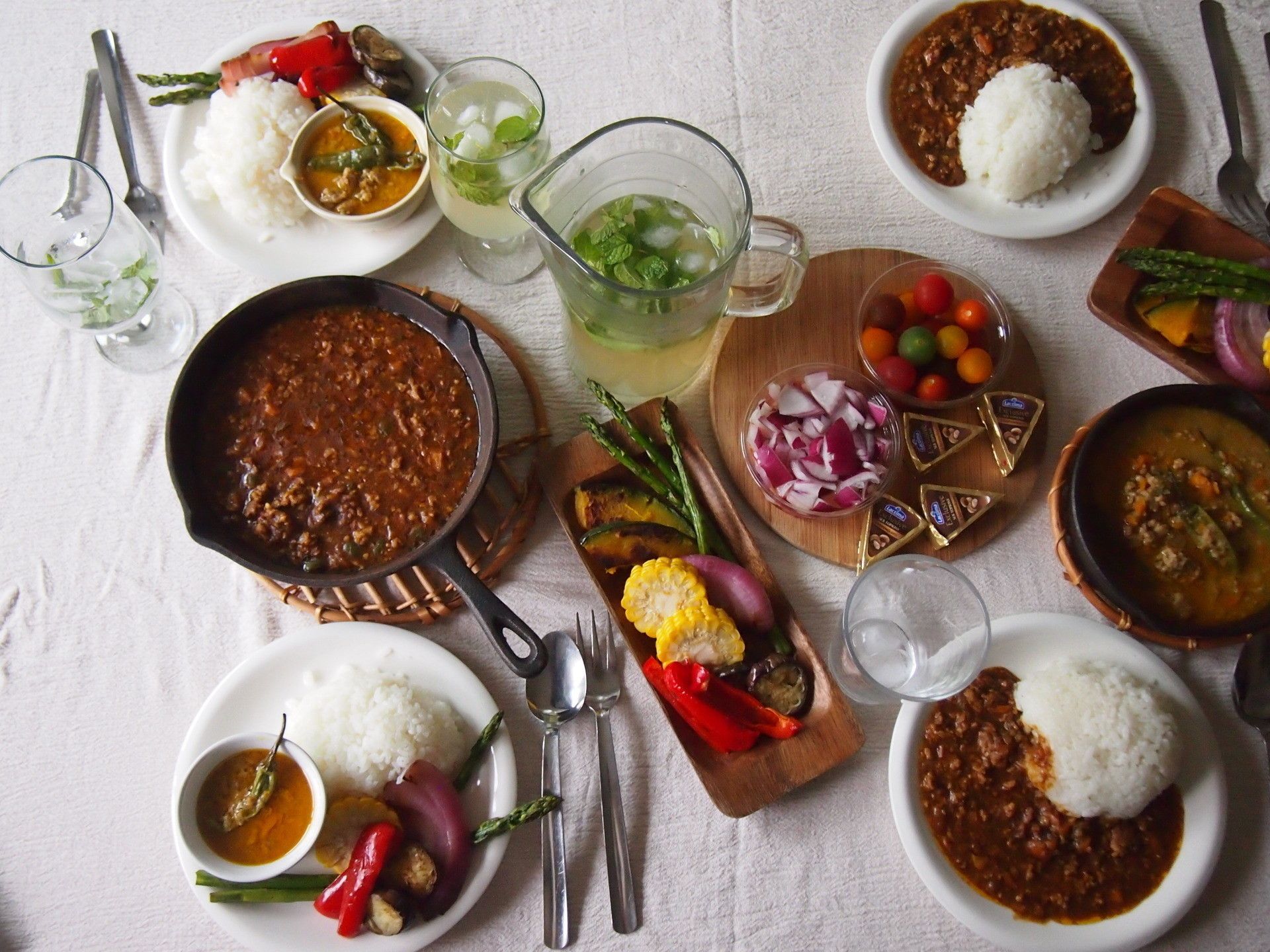 料理そのものも大切だけれど、臼井さんは盛りつけにもこだわりを持っています。大好きな沖縄の器(やむちん)や人気のスキレット、ざるやアカシアの食器……。雑誌やインスタなどで流行の食器をチェックして、テーブルコーデに投入。100円ショップも活用しています。