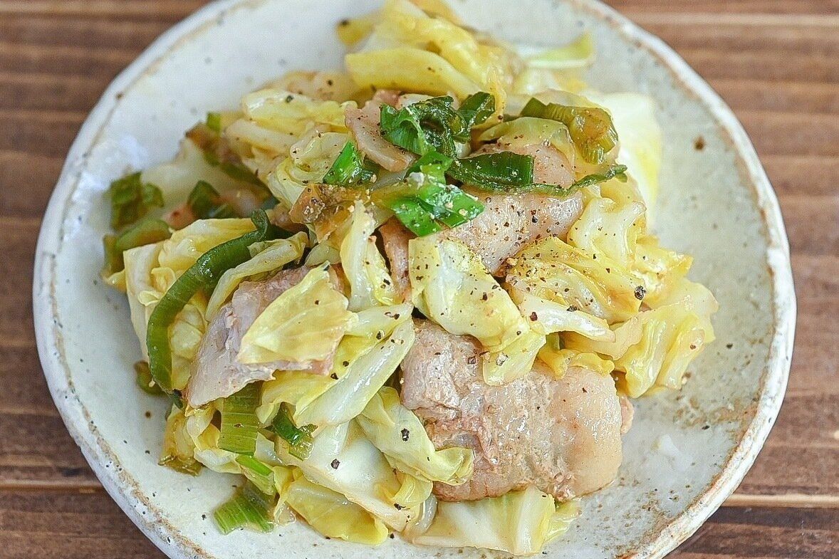 (1)豚バラ肉を食べやすい大きさに切り、キャベツはざく切り、長ねぎは薄切りにする。