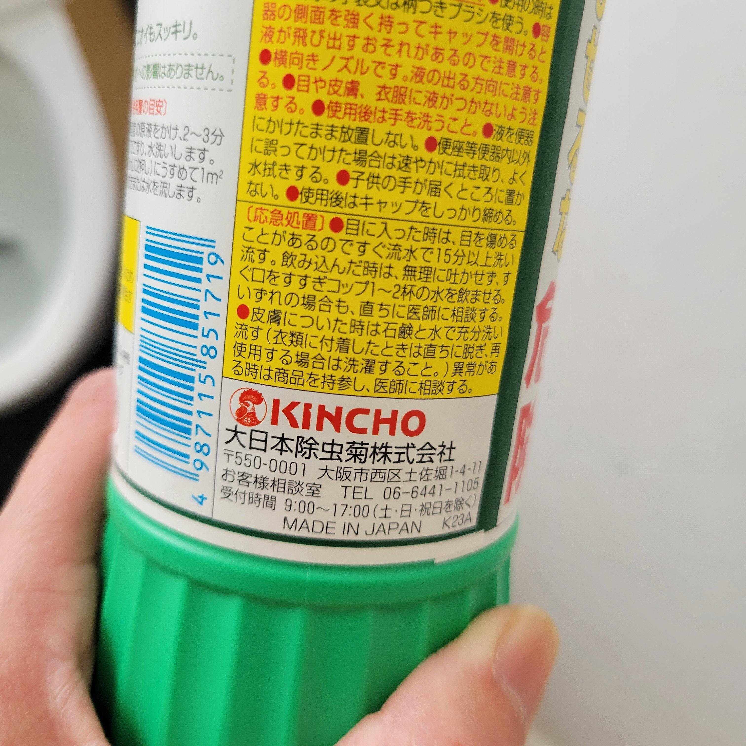 昔からあるトイレ洗剤の力を見せつけられた私は、どんな会社が作っているのか、気になり裏を見てみたらキンチョーでした。