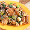 (4)野菜を戻し入れ、「バカッタレ丼のたれ」10gを入れて全体を炒め合わせて完成。
