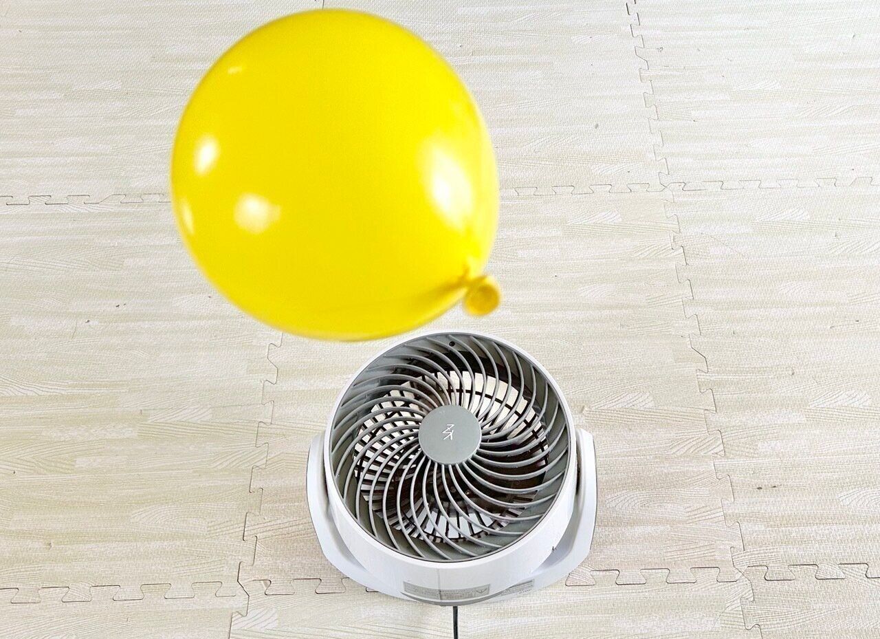 やり方は簡単。サーキュレーターは真上に向けられるので、これを利用して風船を浮かせます。