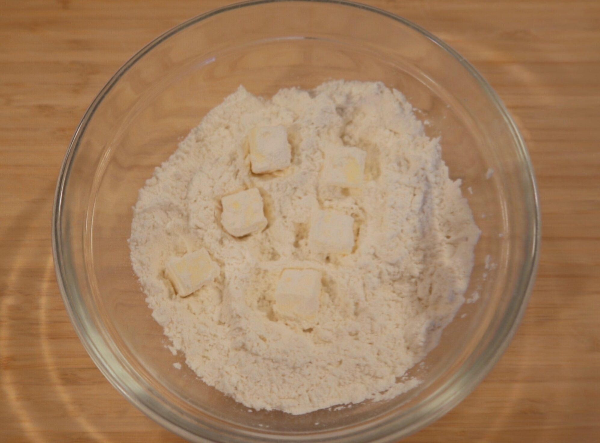 ボウルにホットケーキミックスと冷やしたバターを入れ、かるく混ぜ合わせます。