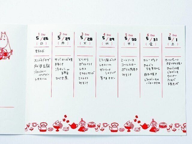 ノートの中身はとってもシンプル。たくさん書き込みができるので、献立を書く以外にも、ウィークリー手帳として使ったり、日記や家計簿にしたり、自由に使えます。