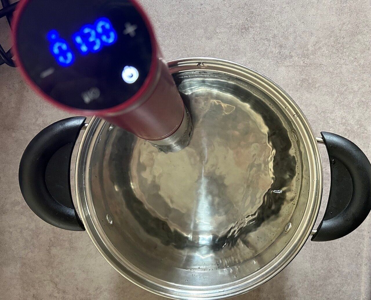 また、わが家では深めのパスタ鍋を使用して、蒸気を防ぐために鍋にラップで蓋をしていますが、低温調理器は、調理する具材をお湯の中に沈めるので、一定量のお湯を使います。