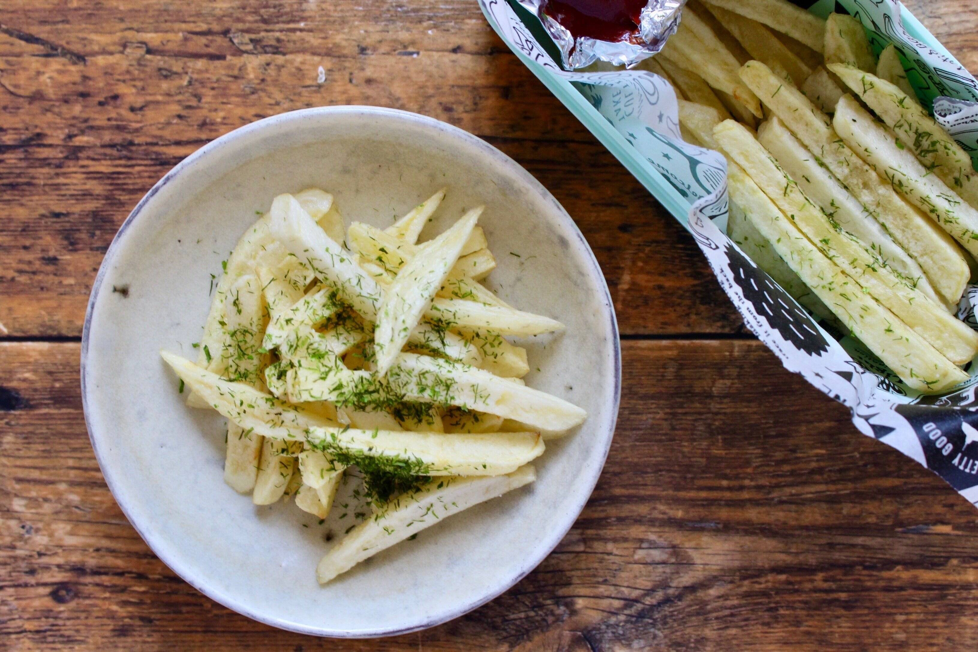 少量の油で揚げ焼きするフライドポテト。