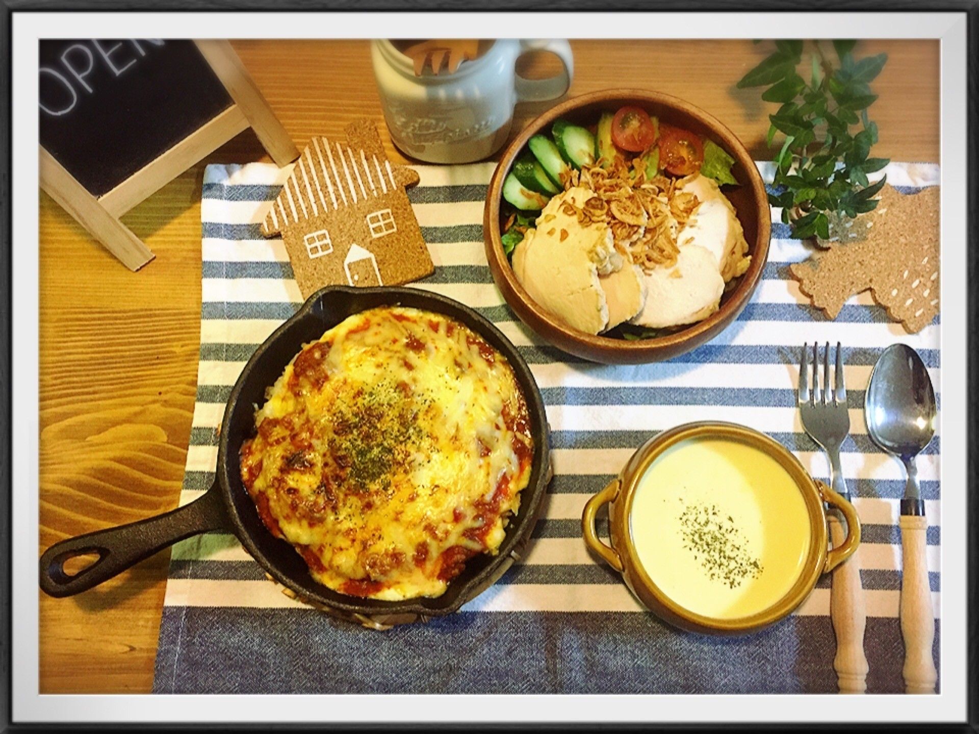 ソースなど多めに作って冷凍保存をしている人も多いのですが、意外とその存在を忘れがちになってしまう事もありますよね。週に1度は保存していた冷凍庫整理を兼ねてお手軽メニューを作っても時短に繋がります。この日は冷凍保存しておいた白米とミートソースで簡単ドリア、そして常備菜で作っておいた鶏ハムのサラダ、コーンスープ!「今何が冷凍されているか」の管理にもなるのでおすすめです。