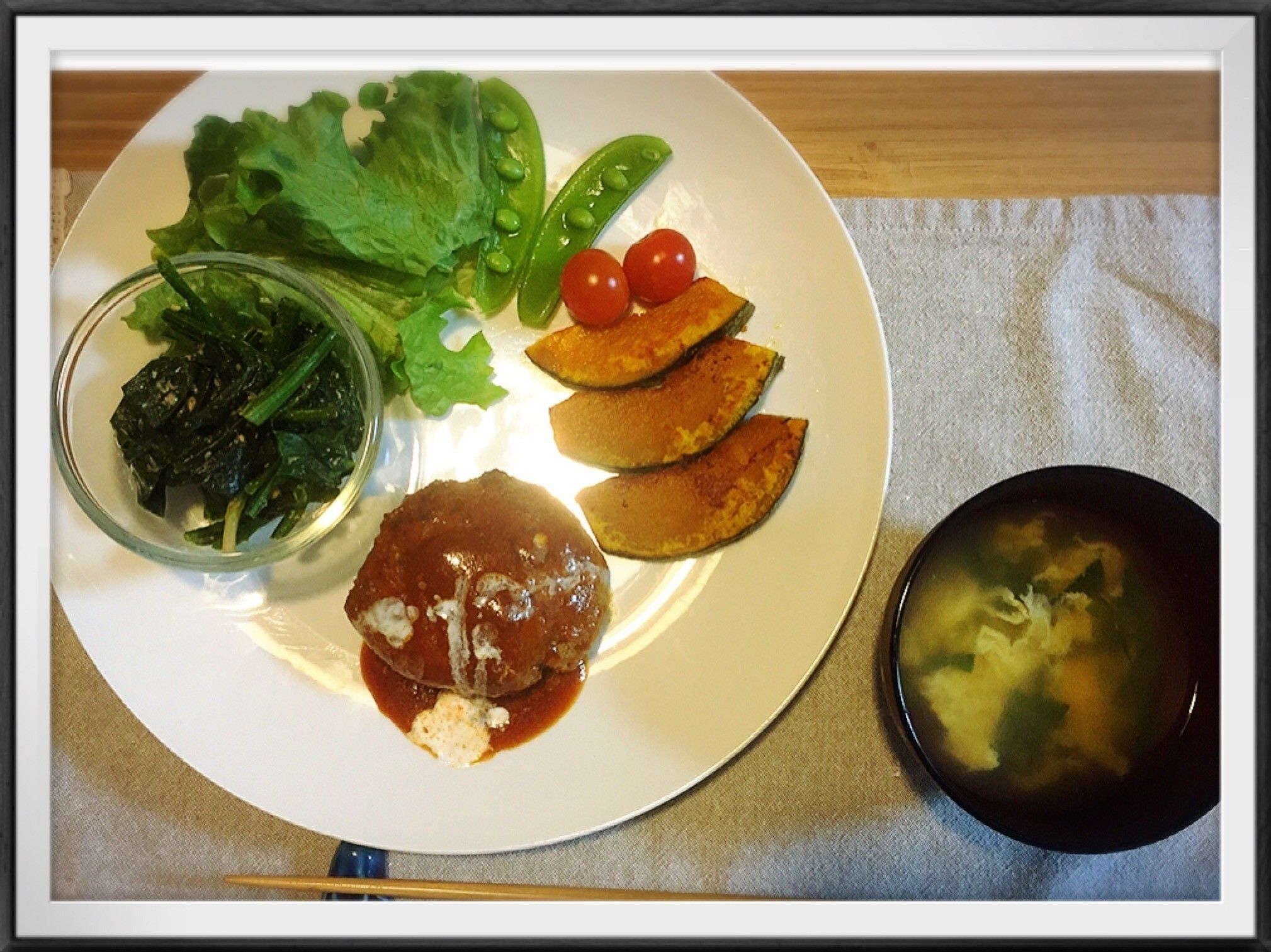 調理法だけ変化をさせても「気づけばなんだか全体的に茶色になってしまった」というあるあるを解消させるのが色のバランスです。レンチンで済むような調理法であれば負担にもなりにくいですよね。この日は彩りとしてほうれん草の胡麻和え(常備菜)、レンチンして焼き色だけつけるカボチャ、そしてノン調理の生野菜で色のバランスをとっています。