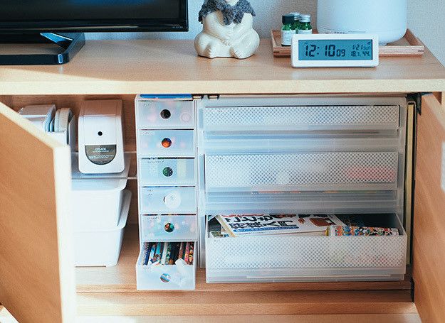 宿題をしたり、絵を描いたりと、子どもたちがリビングで使う細かいものは、テレビ下に。長女、長男、次男とそれぞれ引き出し1段と決め、ポンポン入れればいいだけに。あふれたら自室へ持っていくように約束しています。