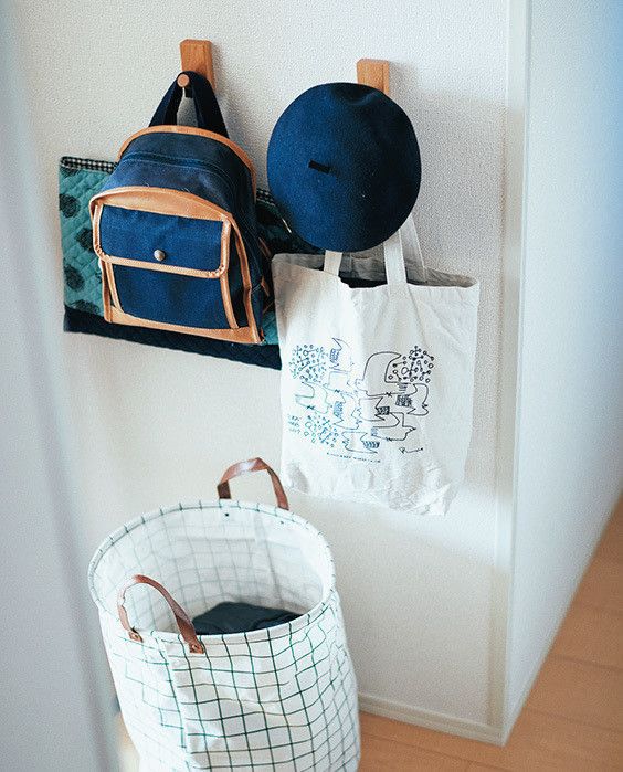 リビングへ入る前の壁には、フックを取りつけて幼稚園のリュックや帽子を掛ける場所に。アウター類は下のボックスにポンと入れるだけ。玄関からの動線上なので、帰宅した流れのままできます。