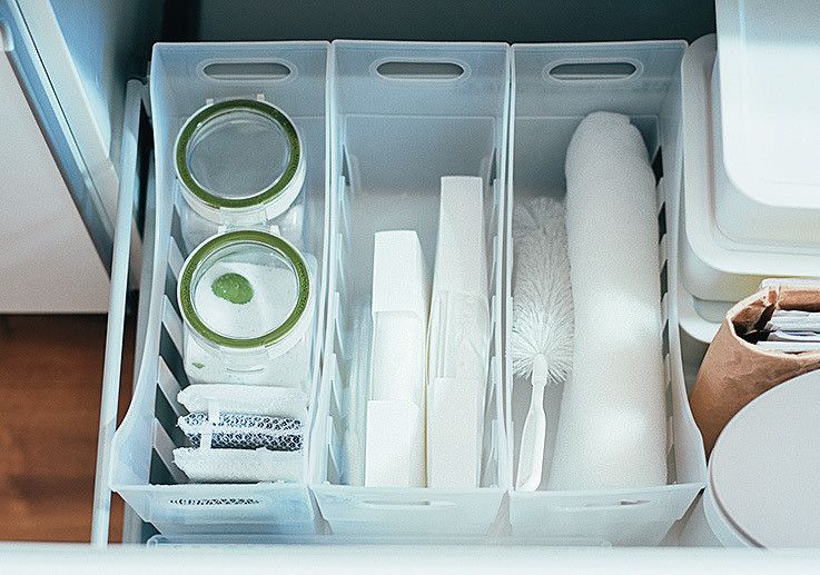 シンク下の深い引き出しでも、書類ケースで仕切り、種類ごとに分ければごちゃつきません。ポリ袋も取り出し口を上にして縦に入れているから、ワンアクションで取り出せてストレスフリー!