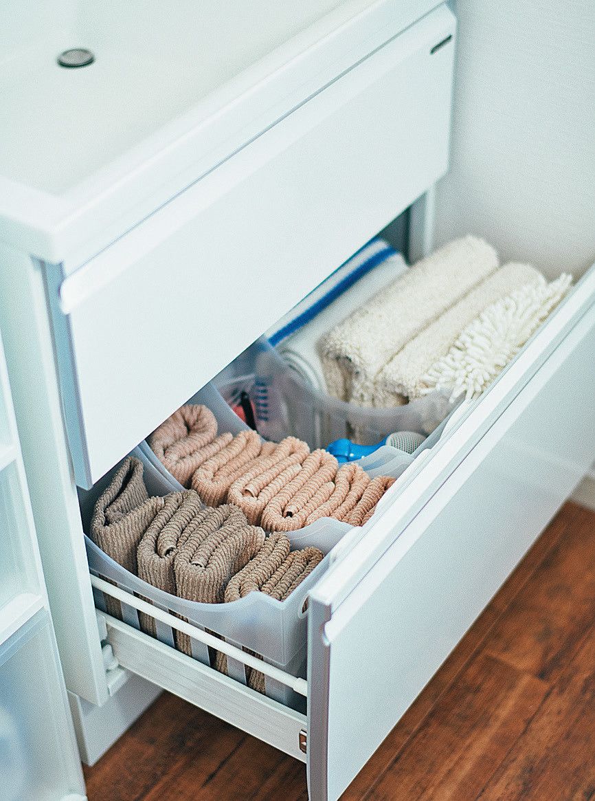 タオルやマットも縦収納なら、くずれない! 出しやすい!