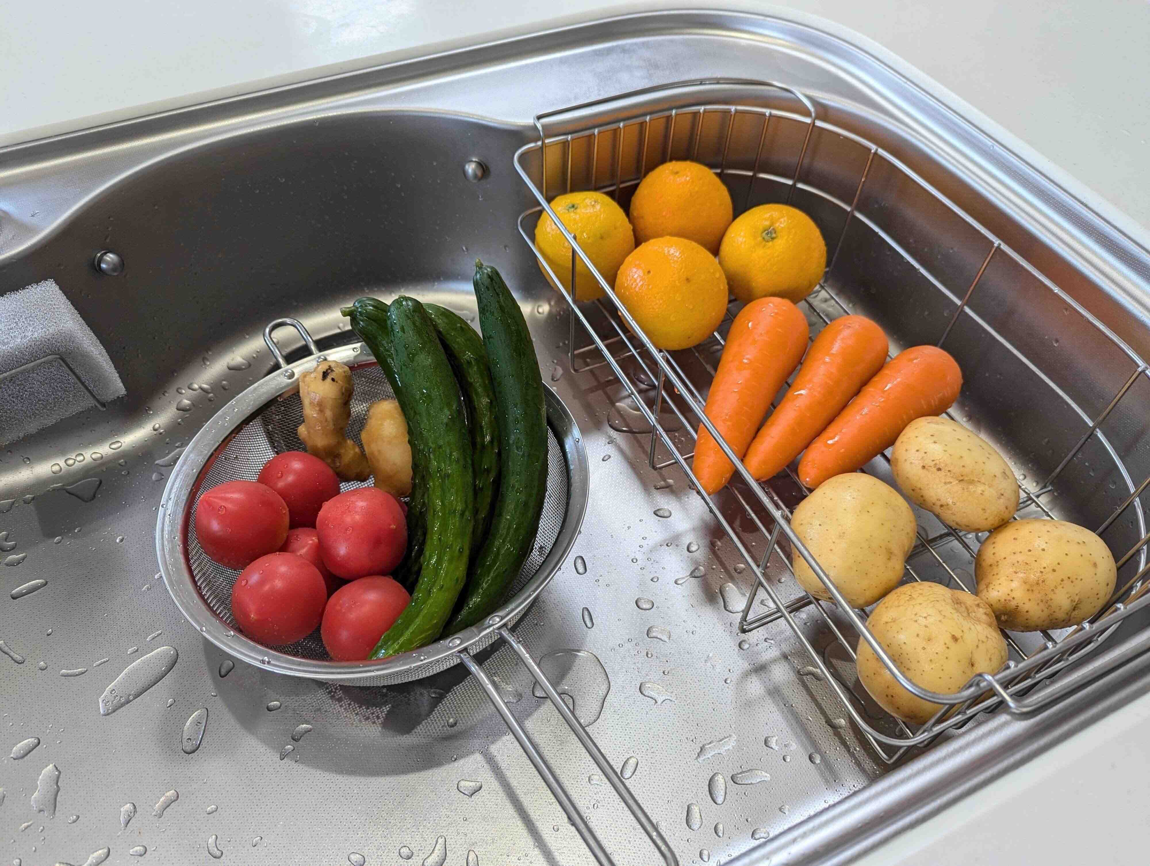 やり方はいたってシンプル。包みを外して水洗いするだけです。洗い終わったものから食器用の水切りカゴにのせていき、キッチンペーパーで水気を拭きとってから保存容器や袋に入れて冷蔵庫へ。