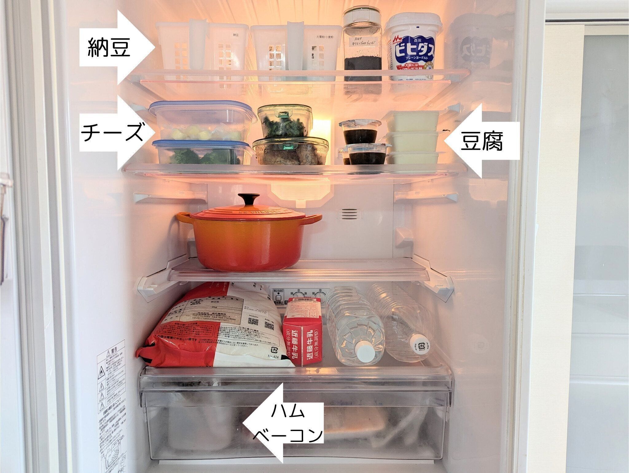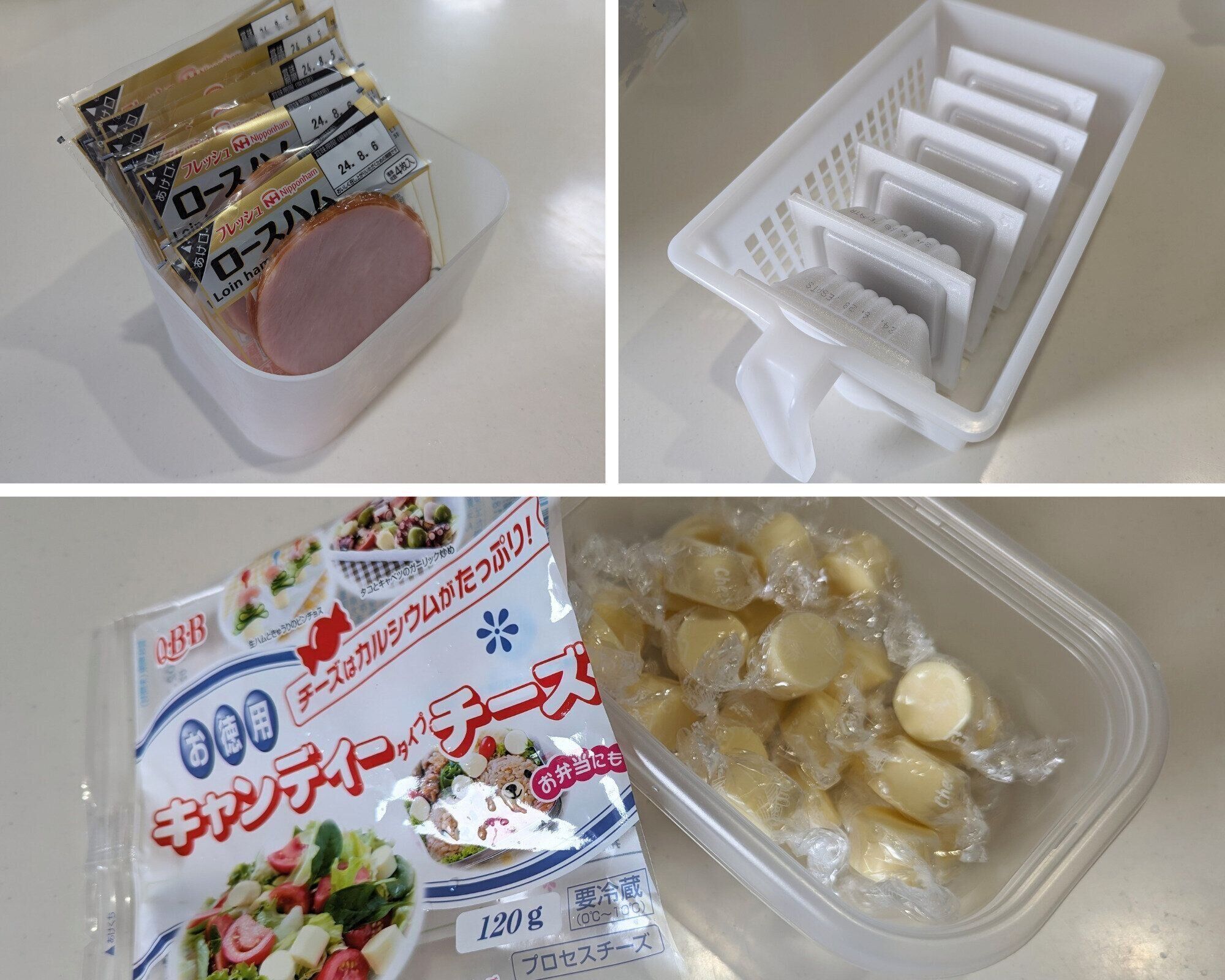 納豆や豆腐、キャンディチーズなどはパッケージを外して、ハムやベーコンはシールをはがしてから冷蔵庫内の定位置へ。