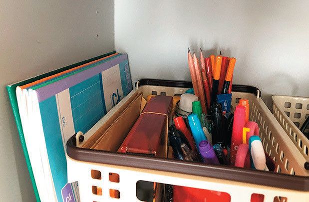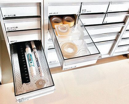 文房具は種類が多いので、アイテム別に引き出しを分けてラベリングすると家族も迷わず出し入れできます。引き出しごと持ち運べば散らからないし、在庫も把握しやすい!(整理収納アドバイザー/勝谷ゆみさん)