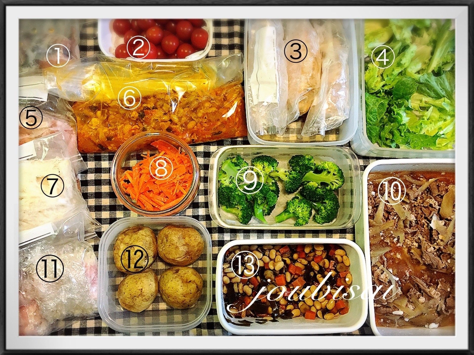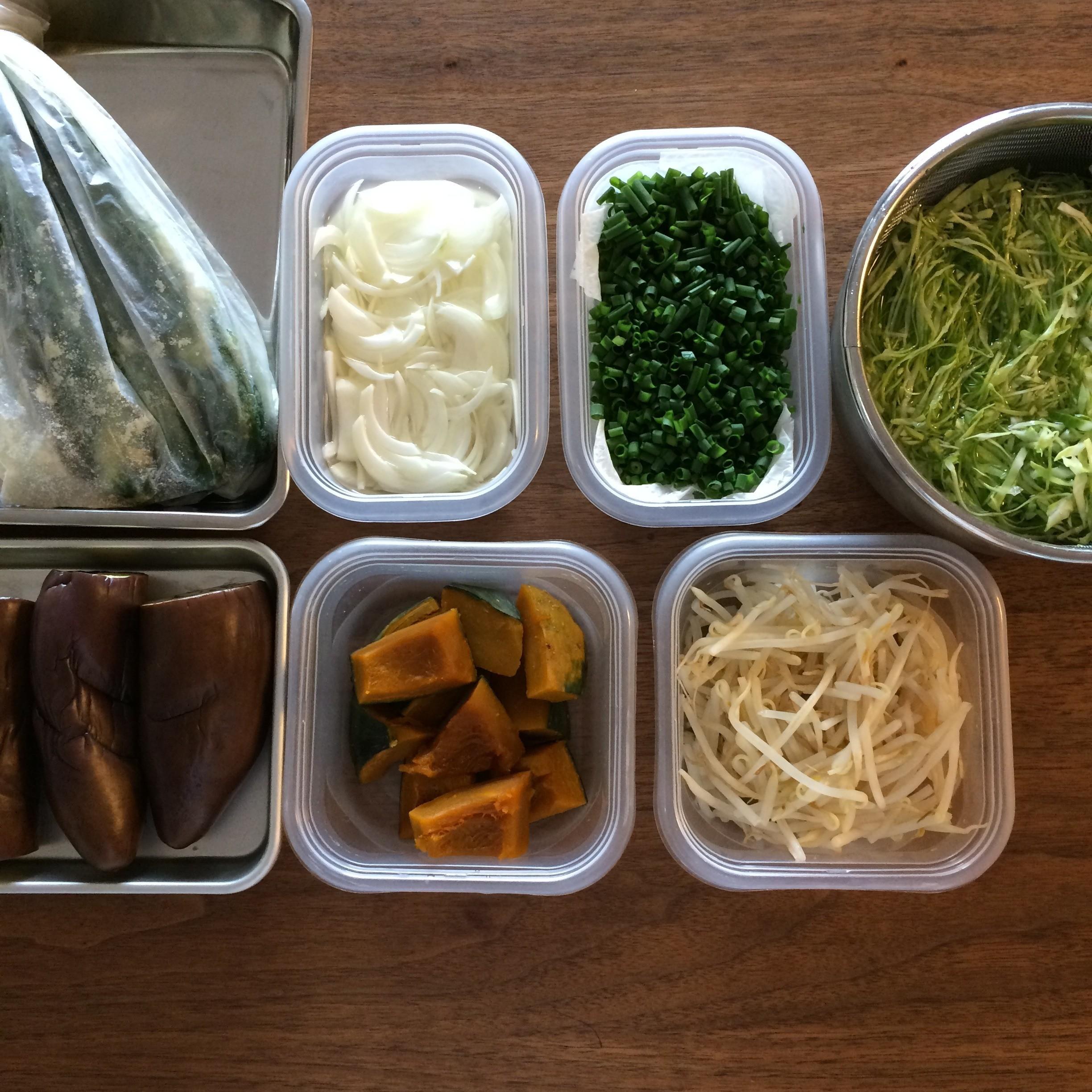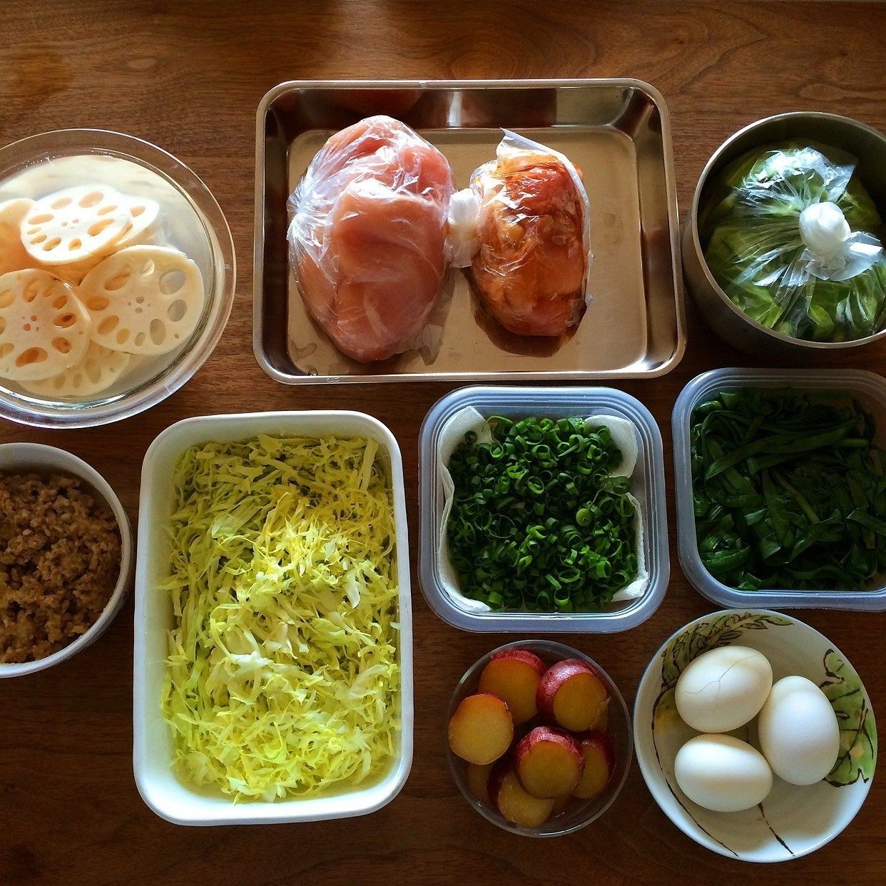 サンキュ!ブロガーMIYUさんのちょい仕込みは、基本切るだけ!冷凍するだけの簡単行程。ミニトマトやちぎりレタスはヘタを取り洗ったら容器にいれてキッチンペーパー。えのきは切手ほぐして冷凍。ブロッコリーは塩ゆでして容器にイン。じゃがいもはレンチンです。