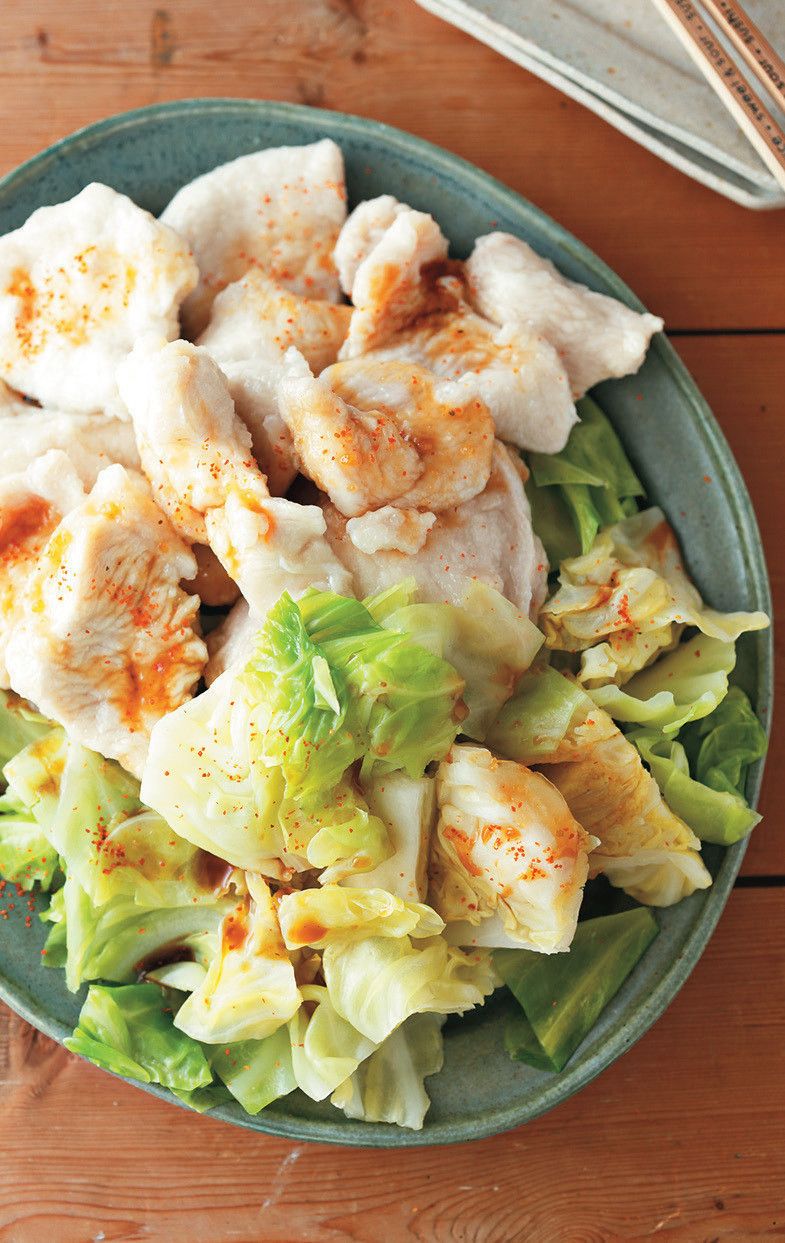 キャベツをしんなりするまで塩ゆでにし、ざるに上げる。同じ湯で鶏肉を2 ~ 3 分ほどゆで、キャベツとともに器に盛る。しょうゆ大3、酢、はちみつ各大1 、おろしにんにく小1/2、粉山椒少々を混ぜてかけ、一味唐辛子少々をふる。