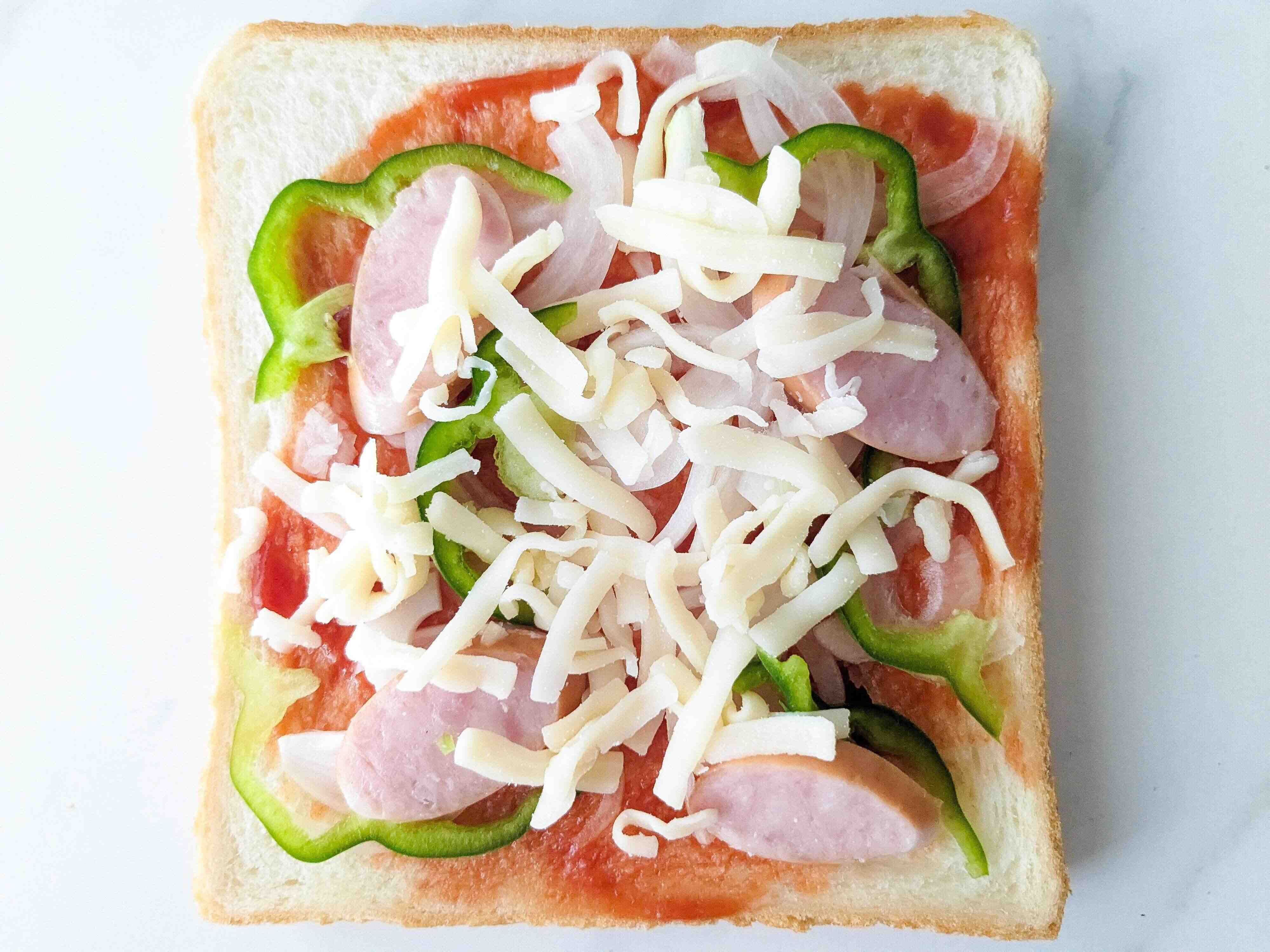2.食パンにケチャップを塗り、その上に具材をのせて最後にチーズをのせる。