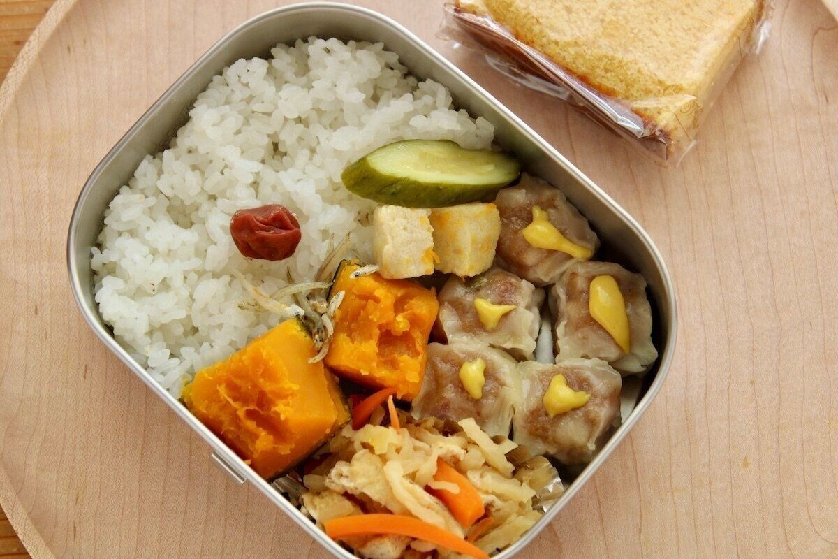 写真のお弁当は、市販のシュウマイを温めて入れました。