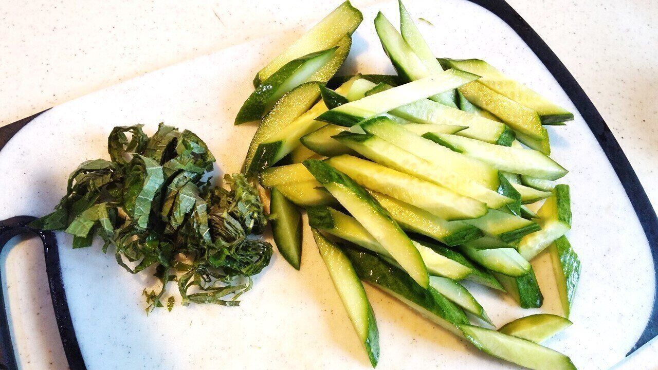 なすは縦半分にしたら1cm厚さの斜め切りに、きゅうりは両端を切り落として5mm幅の斜め切りにしてそれを細切りに、しそはきゅうりより細めの千切りにします。