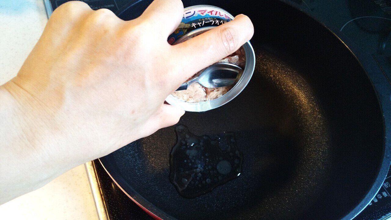 つづいて、ツナの油漬け缶詰のふたを開け、中の油をフライパンに移します。