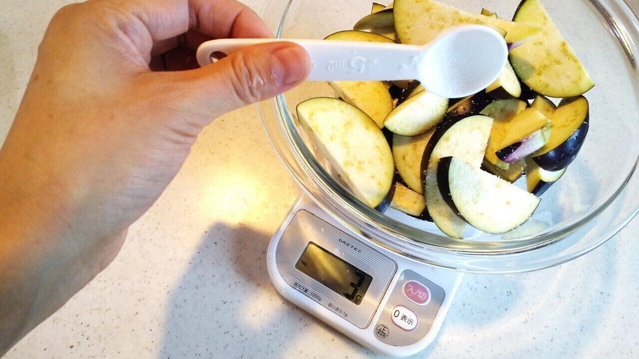 今回使ったなすは3本で280gだったので、塩を3g使いました。