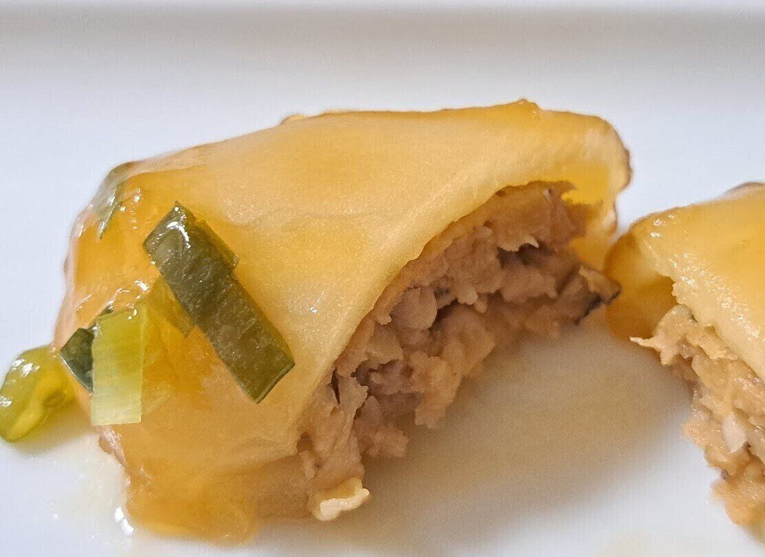 水餃子や小籠包では味わえないちょっと違ったもちもち感で、これまでに食べたことのない食感が楽しいです。皮も想像通り、ちょっと厚めの生地の中にはたっぷりと餡が入っていて、肉の食感と風味がしっかりと味わえます。
