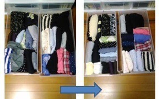 サンキュ!トップブロガー堀江麻衣さんは収納セミナーに参加。ヒントをもらい、さっそく衣類を入れ直しました。引き出しの中に100均ケースを粘着マットで固定、仕切りとして使うことで、見違えるように洋服がビシッと収まりました。タオル収納にも生かせる便利な技です。