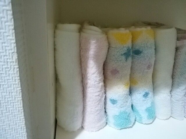 タオルはシンプルに折るだけの畳み方が主流ですが、サンキュ!ブロガーkashimiさんはひと工夫。縦長に三つ折りし、片端に輪をつくるようにすることで、見た目もふんわりキレイになりました。立ったままでも簡単に畳めるのもポイント。「楽に畳めて、キレイ」だなんて一石二鳥ですね。
