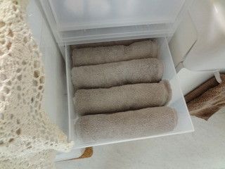 サンキュ!ブロガーの関根美樹さんはタオルを引き出し型のケースに収納。しまい方はもちろん縦! 見た目もスッキリしていますね。洗ったものを奥に入れ、使うときは手前から取り出していくことで、ケースの中でいい循環になっています。
