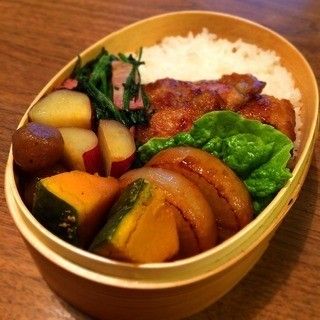 曲げわっぱにお弁当を詰めたのは、サンキュ!トップブロガーの野口ゆかさん。メインの生姜焼きのほか、大根ステーキ、ほうれん草とベーコンのソテー、さつまいもの砂糖煮とかぼちゃ煮で栄養もばっちり。すき間ができやすい楕円形のお弁当箱ですが、そこは玉こんにゃくの煮物を使ってキレイに埋めています。