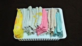 隙間時間のちょっとしたお掃除に役立つウエスをまゆしのさんは衣替えのたびに作りためておくそうです。サイズに合わせてお掃除ポイントを変えるのもポイント♪手前の小さいものは洗面台のちょっとしたお掃除に優秀!