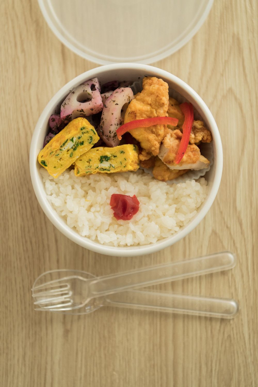 から揚げや天ぷらなどの揚げものは、酸味のあるタレに漬けておくと冷めてもおいしい! 写真は夕飯の鶏天をぽん酢に漬けておいたもの。翌朝はそのまま詰めればOKです。野菜も保存ついでに夜に漬けておくと、味がしみていて◎。こちらも詰めるだけでよいからラクなんです。