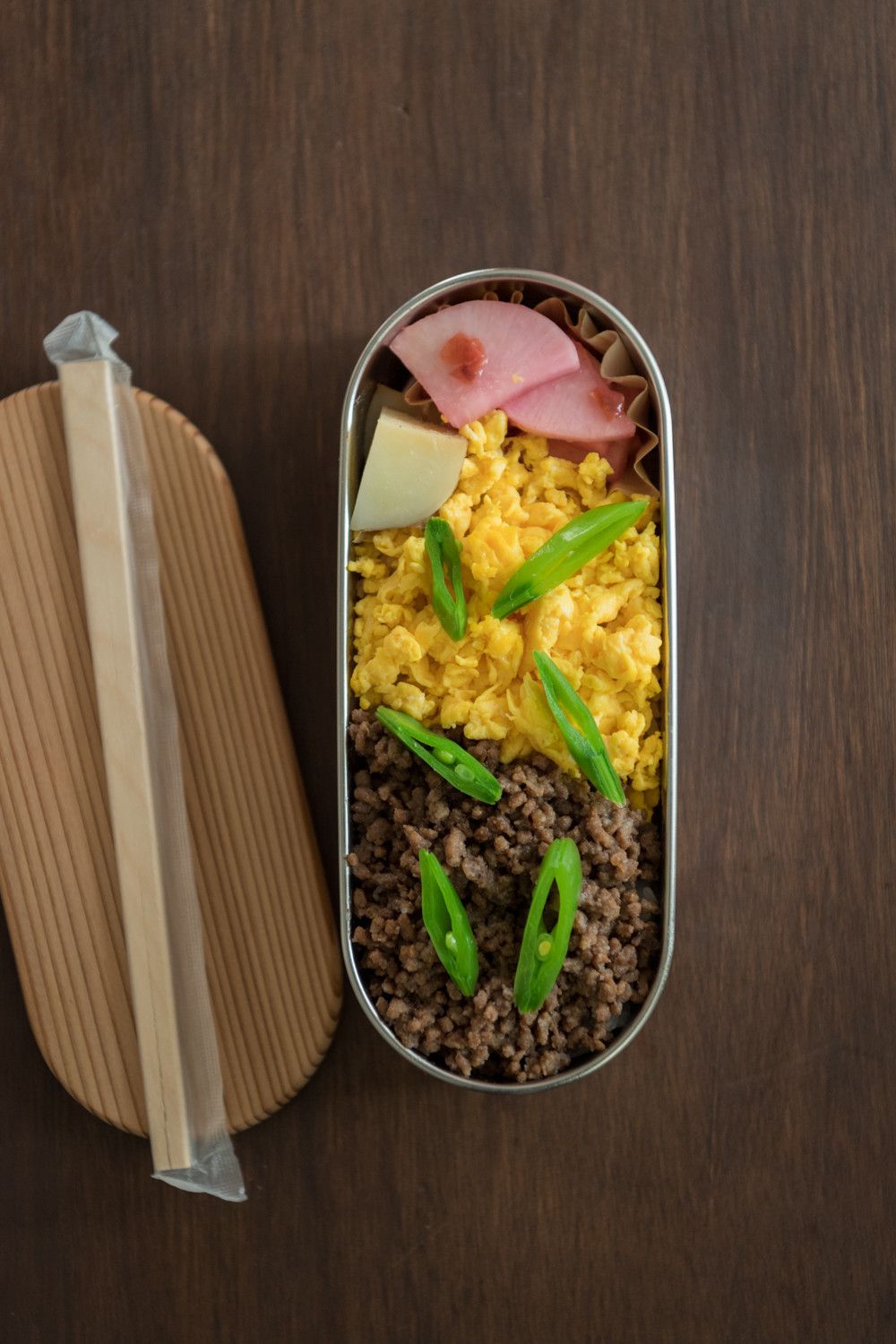 ひき肉の煮ものやすき焼きなど、夕飯が煮物系だった翌日はごはんの上にのせてしまいましょう。ミートソースのときは、カレーと混ぜてドライカレー丼に♪ 写真は、夕ごはんの新じゃがとひき肉の煮もののそぼろを取っておいて、そぼろ弁当にしたもの。昨日の残りとは気づかない!
