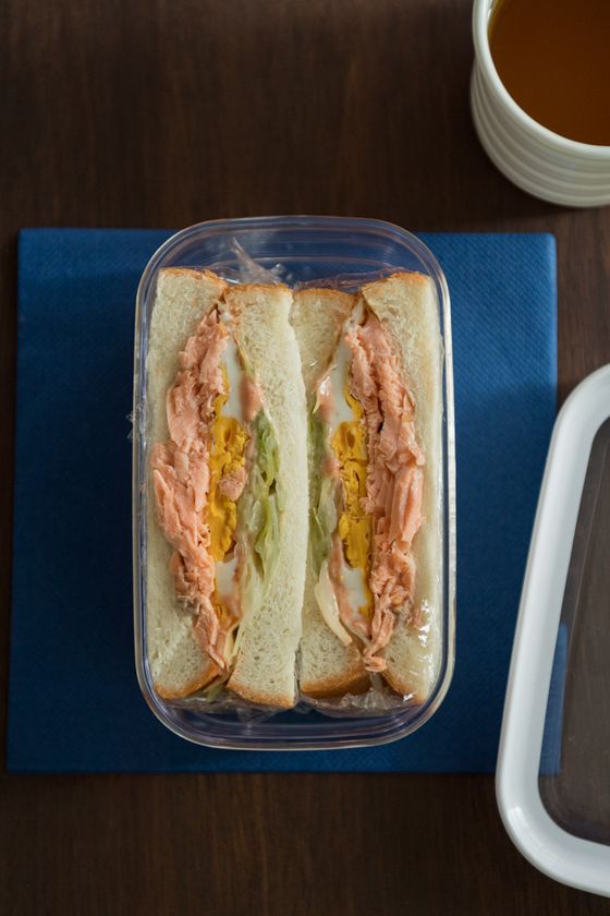 おかずをパンにはさむのも手。野菜炒めやエビチリ、チンジャオロースなど、意外な組み合わせが楽しめます。ただし、汁気がないものを選んで。写真は夕ごはんの鮭とキャベツの蒸し煮を目玉焼きと、ケチャップ&マヨネーズを混ぜ合わせたソースをかけてはさんだもの。パンでもボリューム満点!