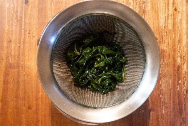 3、戻したわかめはしっかり水を切り、好きな大きさにカットする