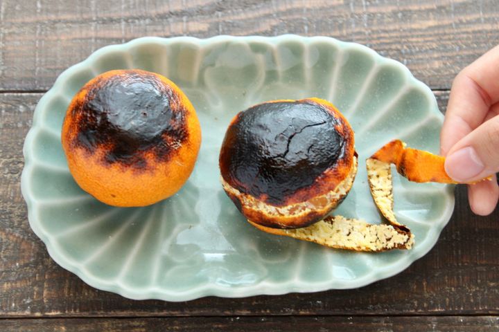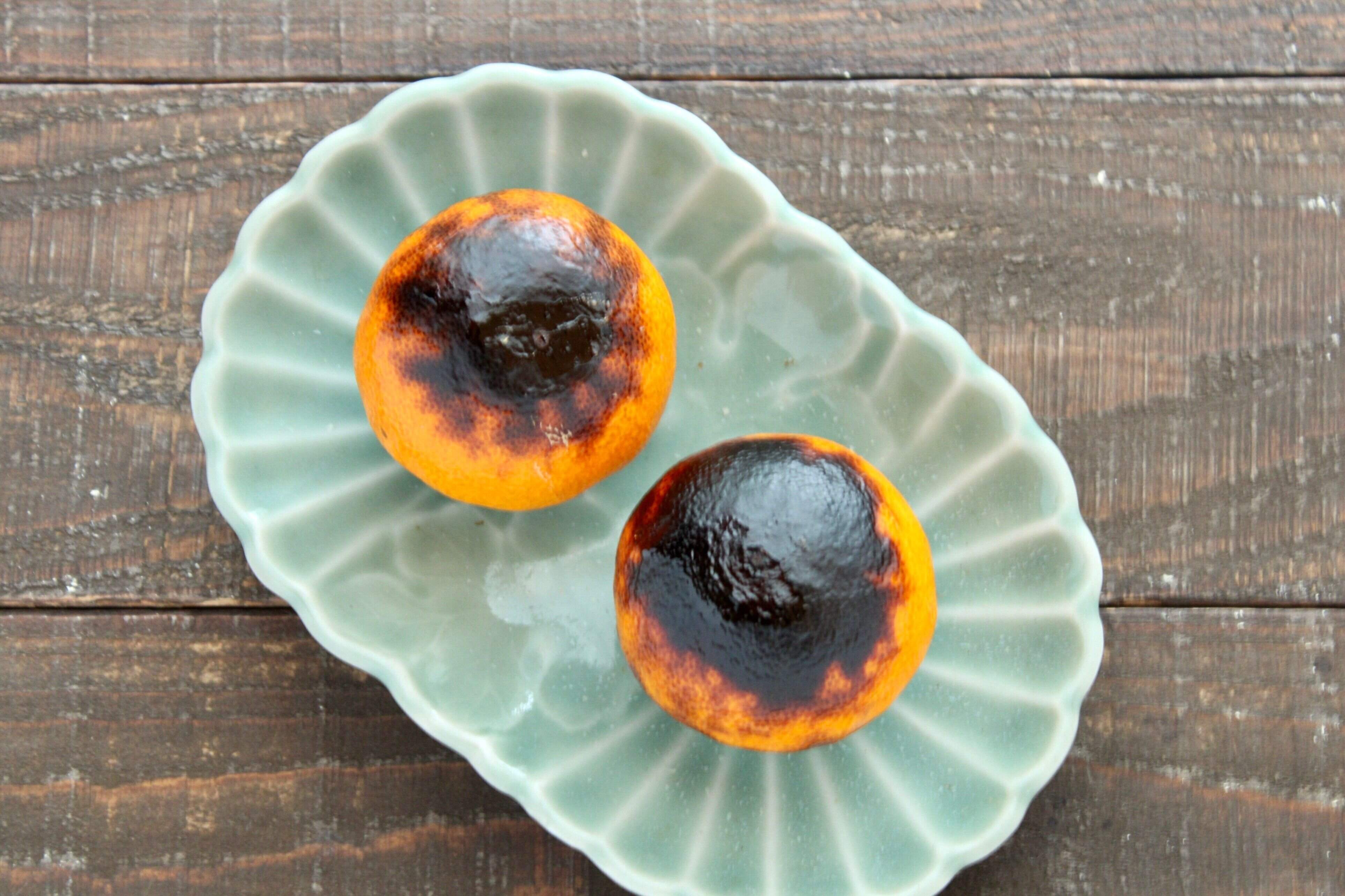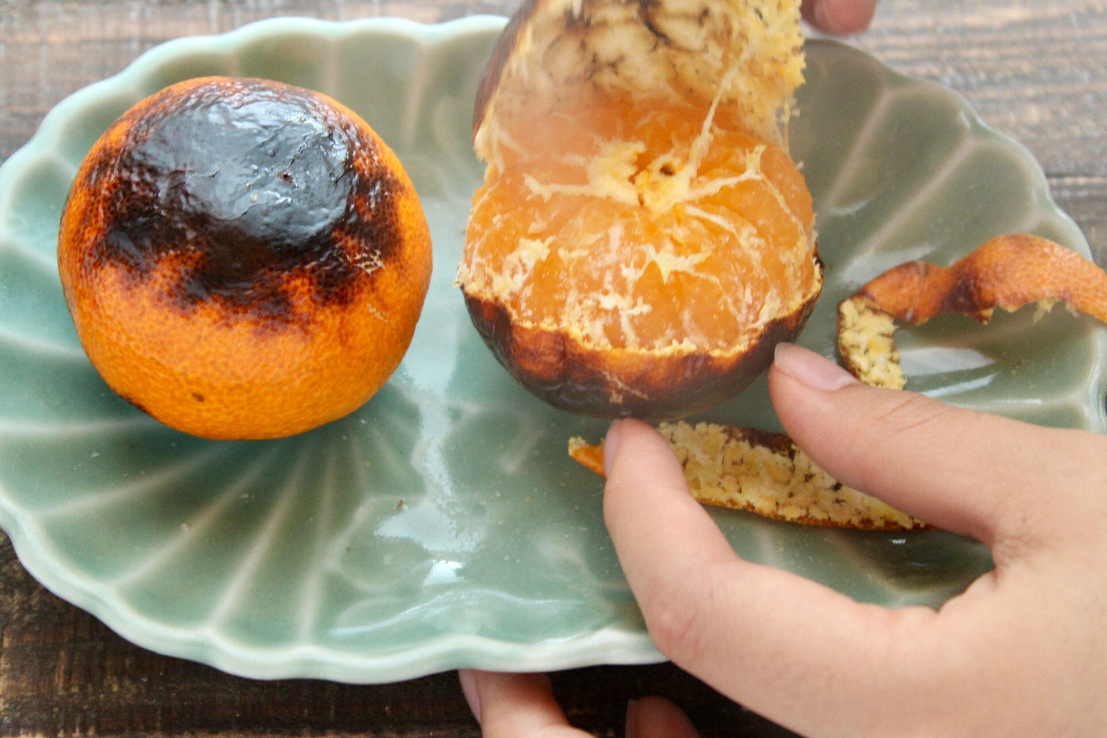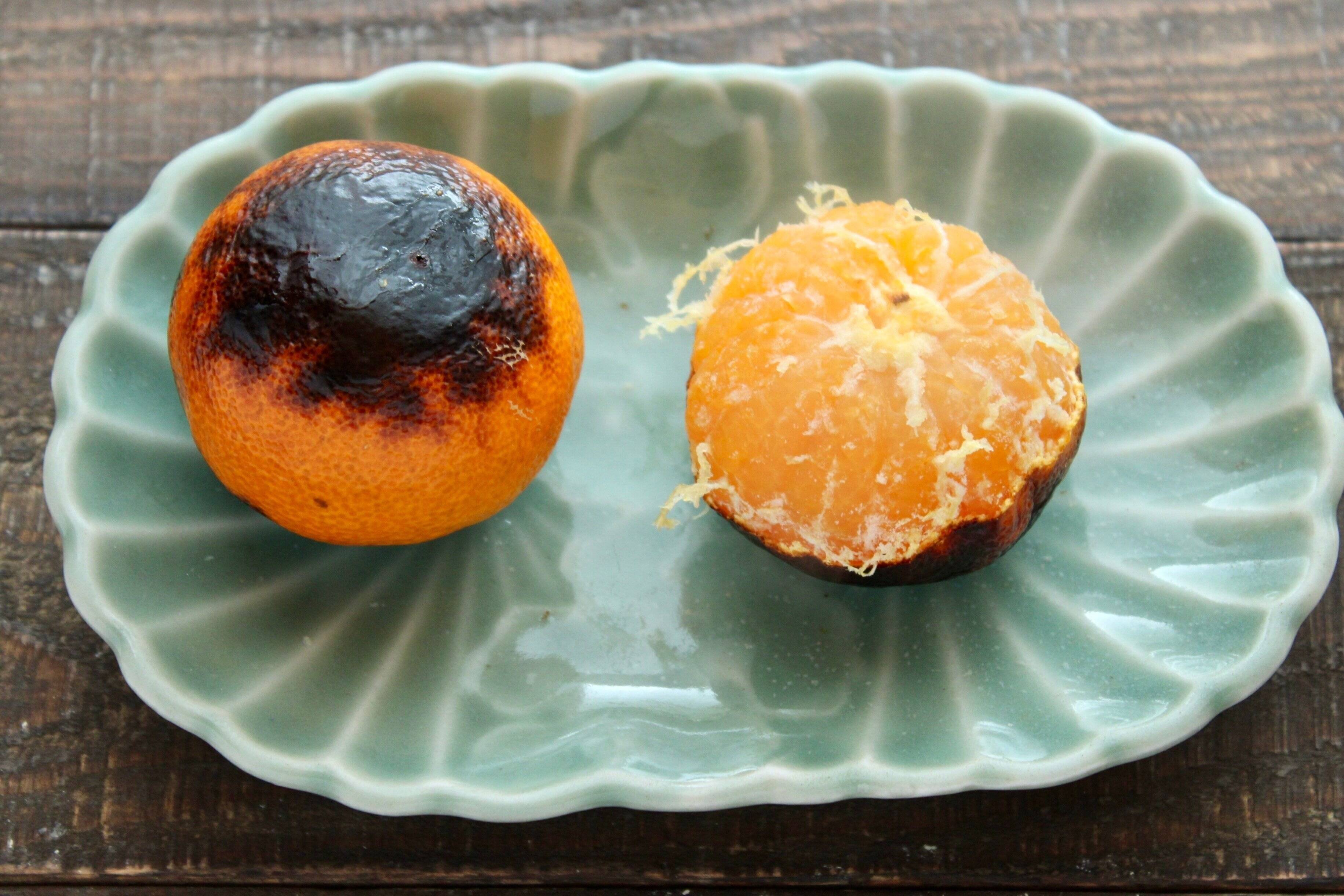 みかんを焼くと、生で食べるよりも甘くてジューシーなうえに、燻製のような香りが楽しめます。