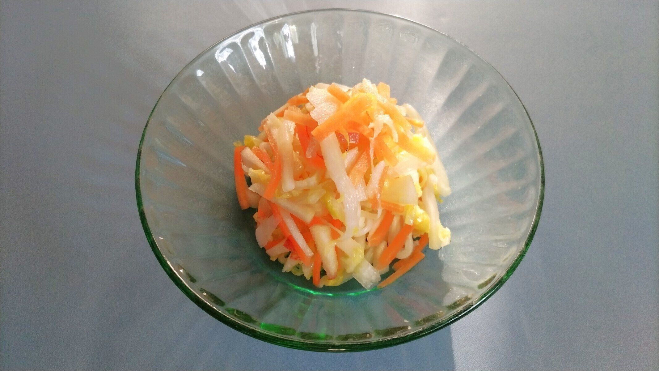 3. 切った白菜、にんじんに塩をもみこみ、しんなりするまで置いておく。