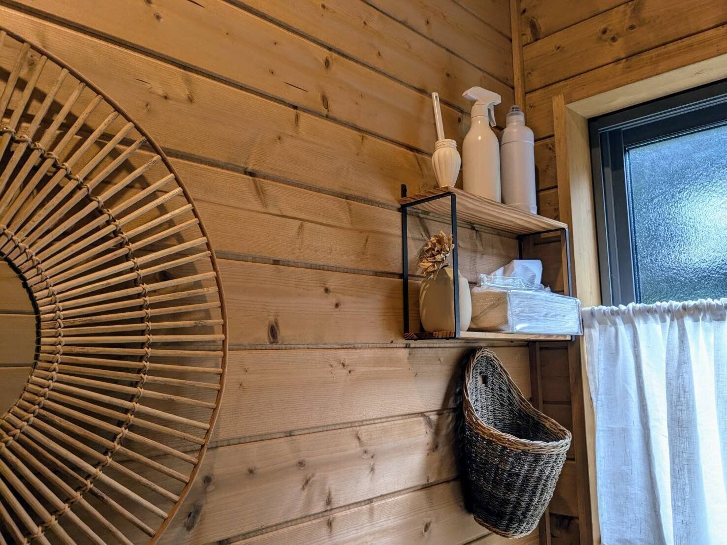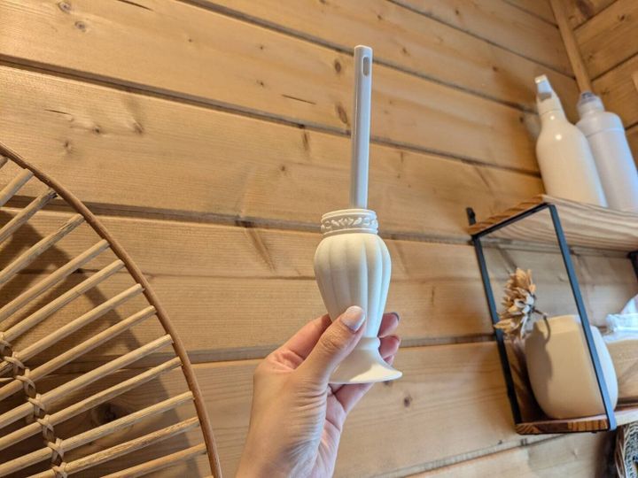 かける収納ができるデザインですが、筆者宅では汚れの気になる便座裏に使用しているため、あえてかけていません。100円ショップの「セリア」で買ったインテリアグッズに入れることで、トイレ内に馴染むように置いていますよ。