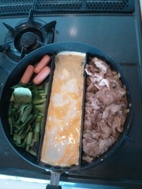 ブロガーのmichiyoさんは、仕切りのあるフライパンを使って、複数のおかずを同時進行で調理しています。愛用の「センターエッグトリプルパン」で調理すれば、お弁当のおかずを一気に作ることが可能に。しかも、真ん中の玉子焼きは卵1個で作れちゃうそうです。時短かつ経済的ですね♪