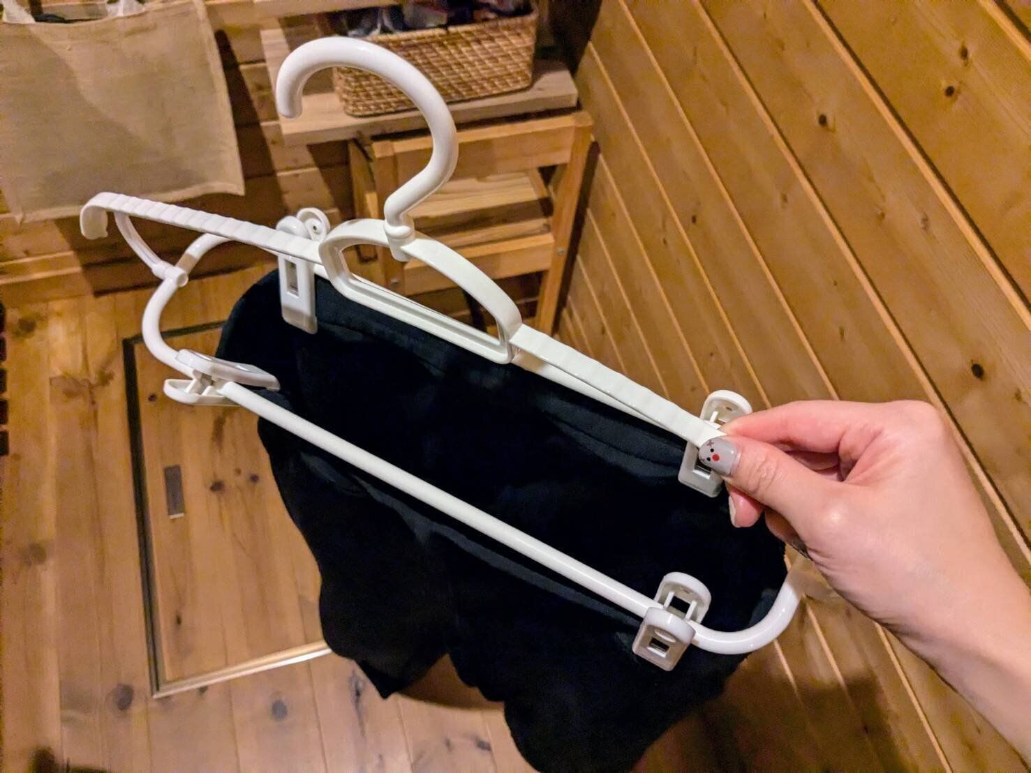 こちらも家事を少しでもラクしたい筆者が、何年も愛用しているアイテムです。大きめのハンガーにピンチフックが4つ付いているので、ズボンに空洞を作ることができます。空気の通り道ができることで、一般的なハンガーと比較すると、その乾きやすさは雲泥の差!