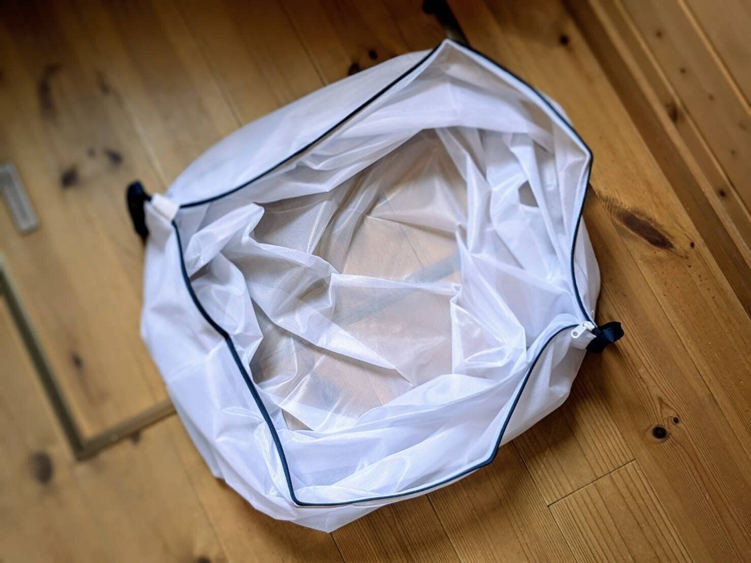 布団やラグなどの大物を入れるときに助かるのが、この大きく開く口です!いくら中が広くても、口が小さいと出し入れが大変ですが、ここまで大きく開くのでノンストレス。筆者宅では、衛生面が気になる子どもたちのぬいぐるみも、この洗濯ネットに入れて洗濯しています。大容量のお陰で、一気に洗濯できるのが助かりますね。